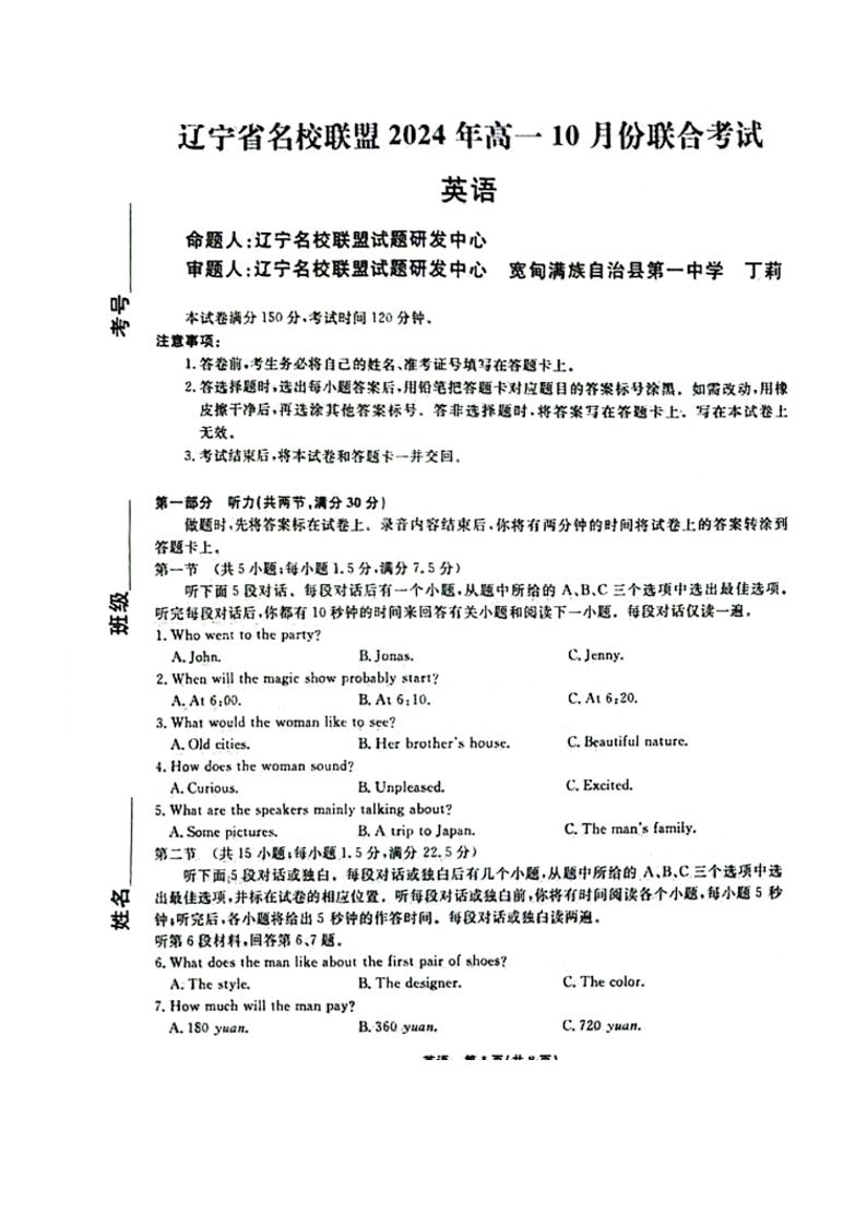 辽宁省名校联盟2024年高一10月份联合考试英语+答案