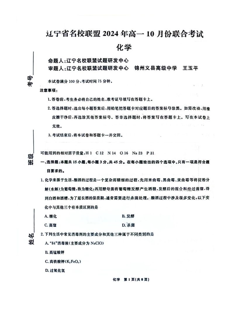 辽宁省名校联盟2024年高一10月份联合考试化学+答案