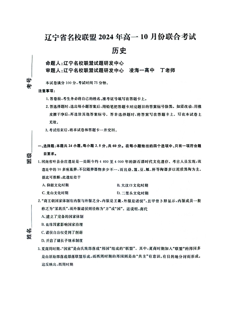 辽宁省名校联盟2024年高一10月份联合考试历史+答案