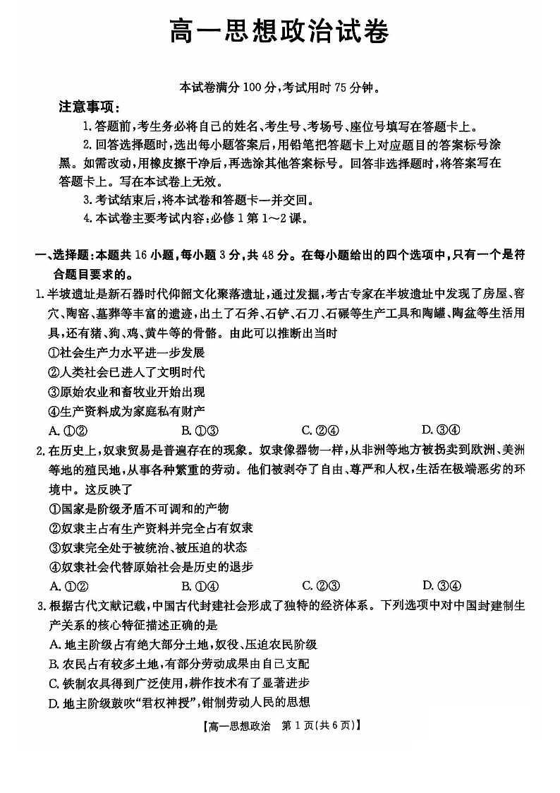 辽宁省普通高中2024-2025学年高一上学期10月月考政治