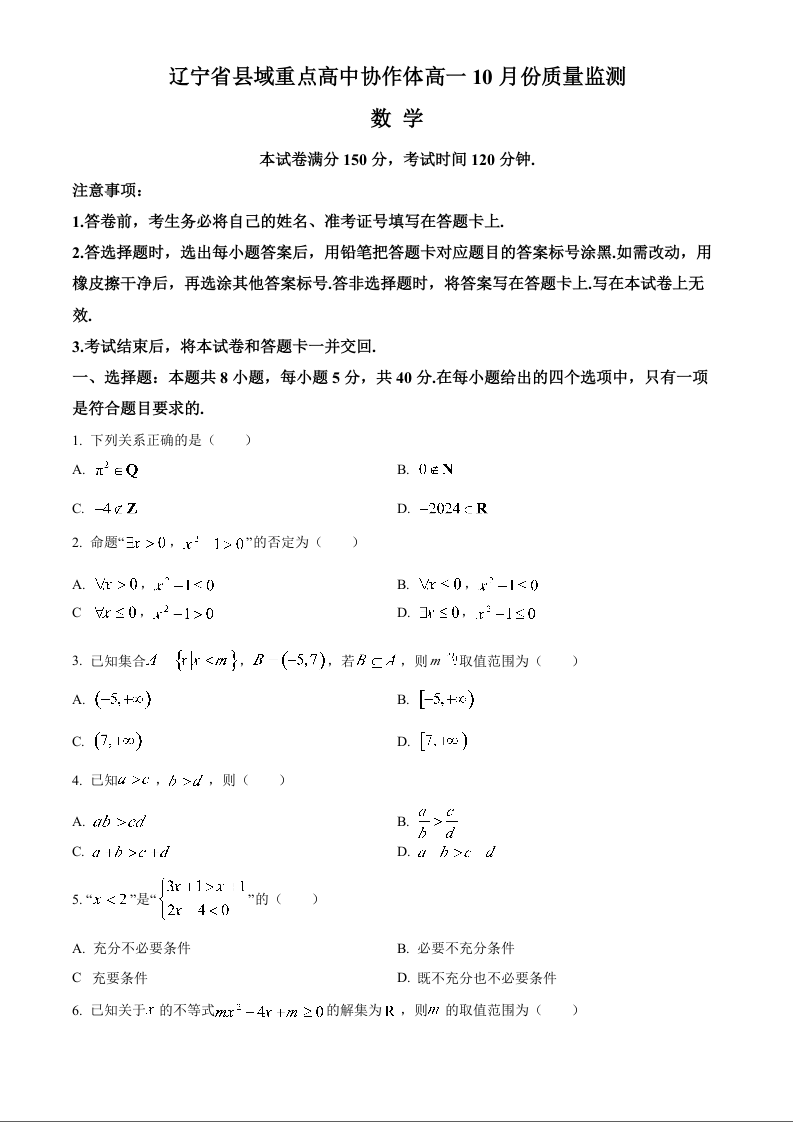 辽宁省县域重点高中协作体高一10月份质量监测数学+答案
