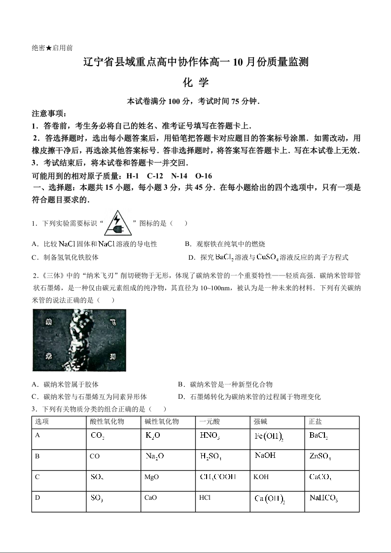 辽宁省县域重点高中协作体高一10月份质量监测化学+答案