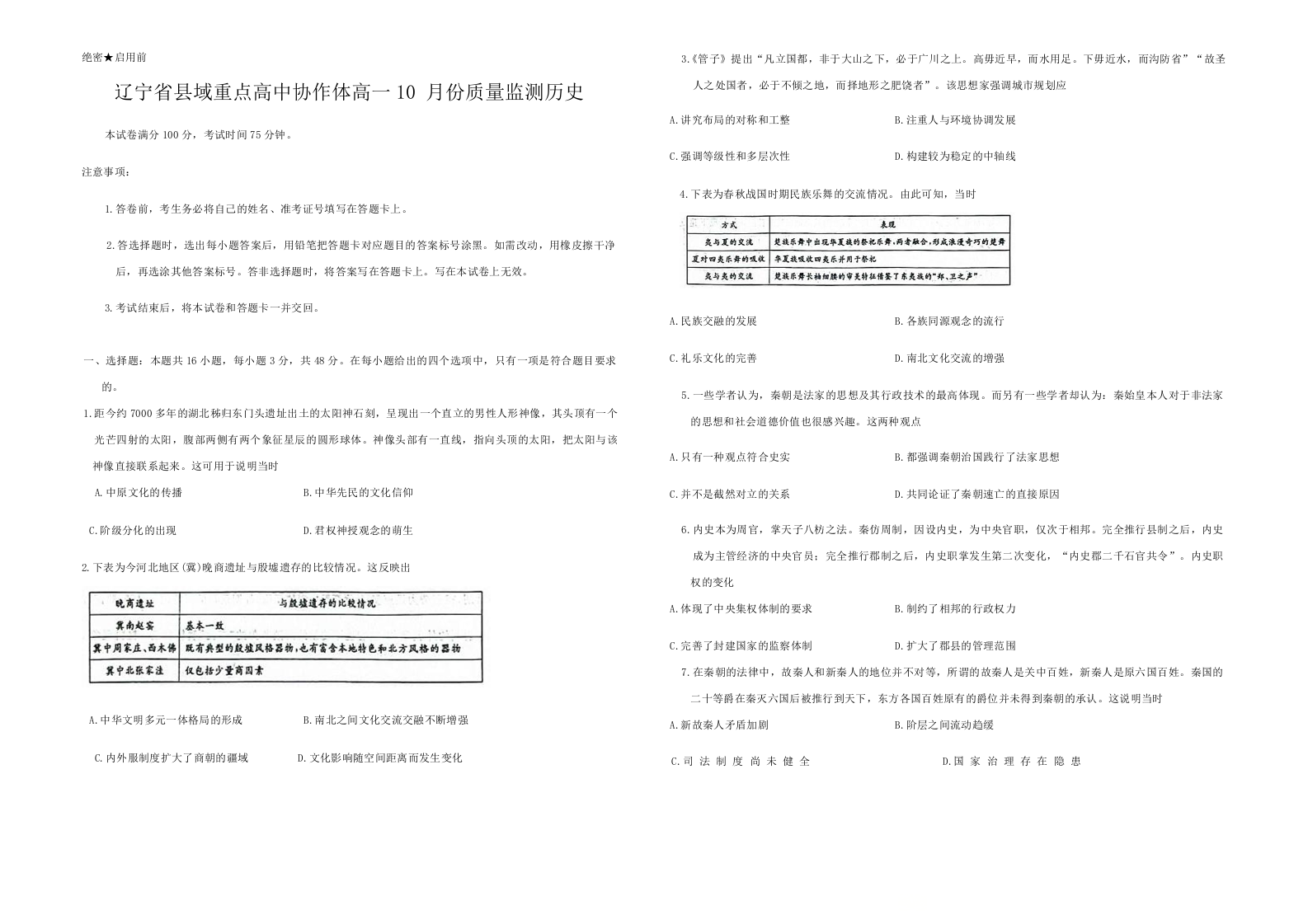辽宁省县域重点高中协作体高一10月份质量监测历史