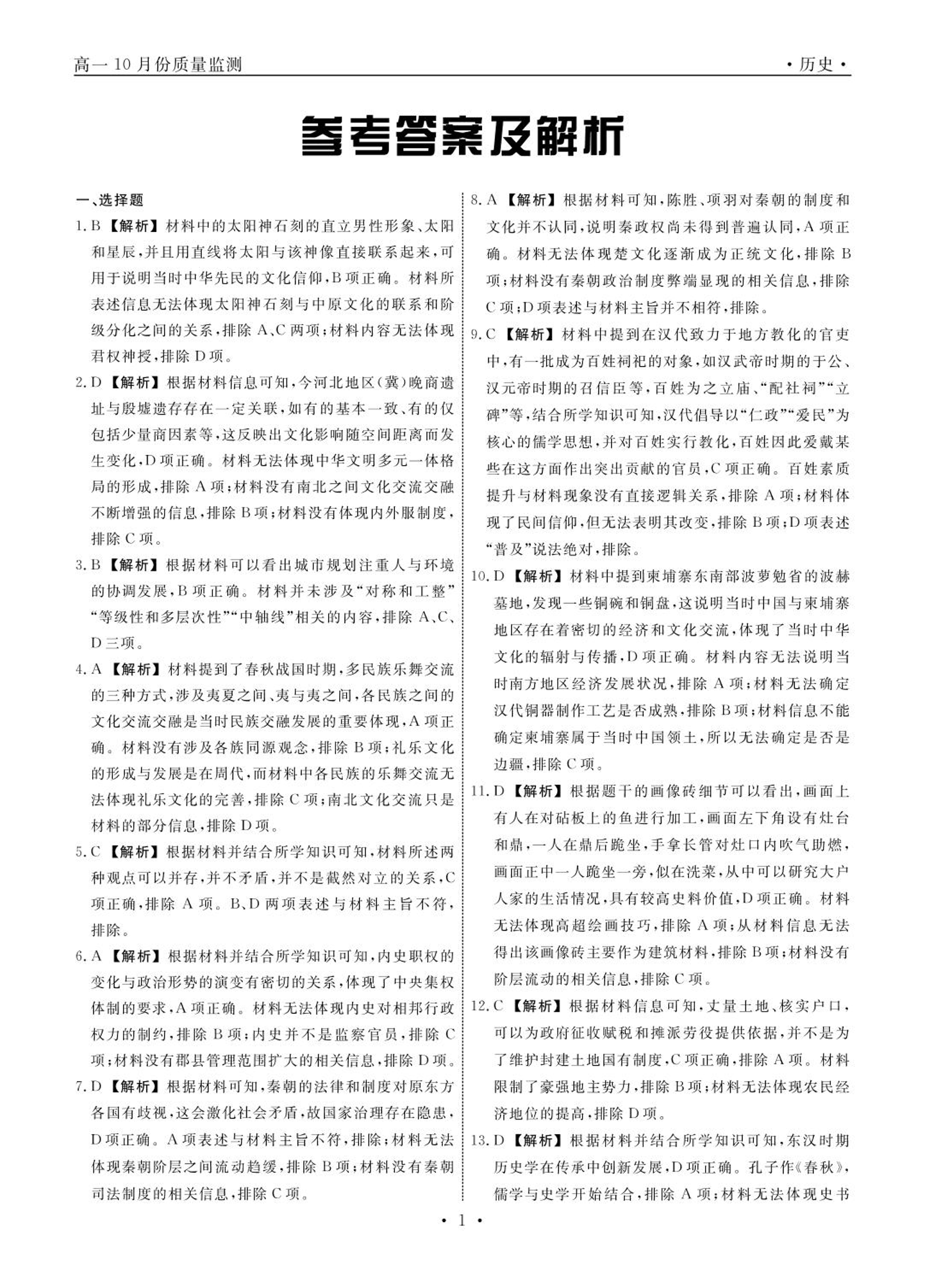 辽宁省县域重点高中协作体高一10月份质量监测历史答案