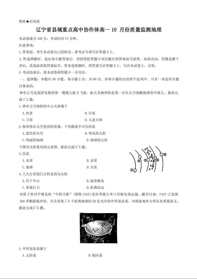 辽宁省县域重点高中协作体高一10月份质量监测地理