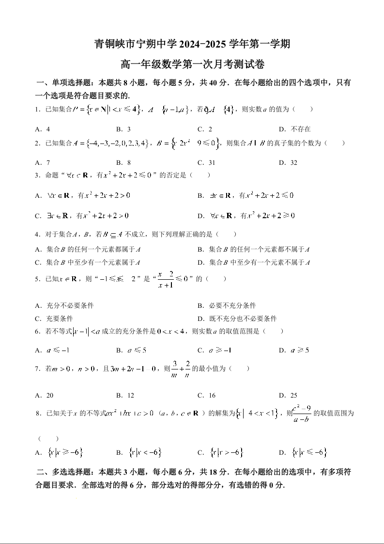 宁夏回族自治区青铜峡市宁朔中学2024-2025学年高一上学期9月月考数学+答案