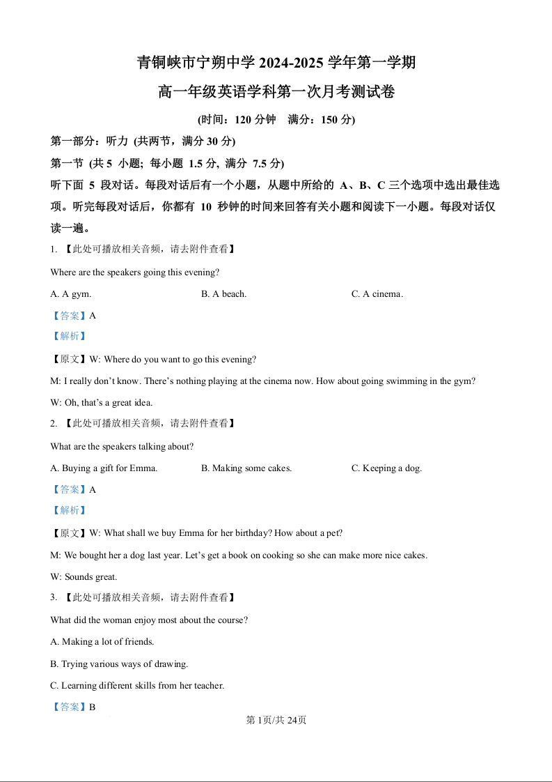 宁夏回族自治区青铜峡市宁朔中学2024-2025学年高一上学期9月月考英语(含听力)(解析版)