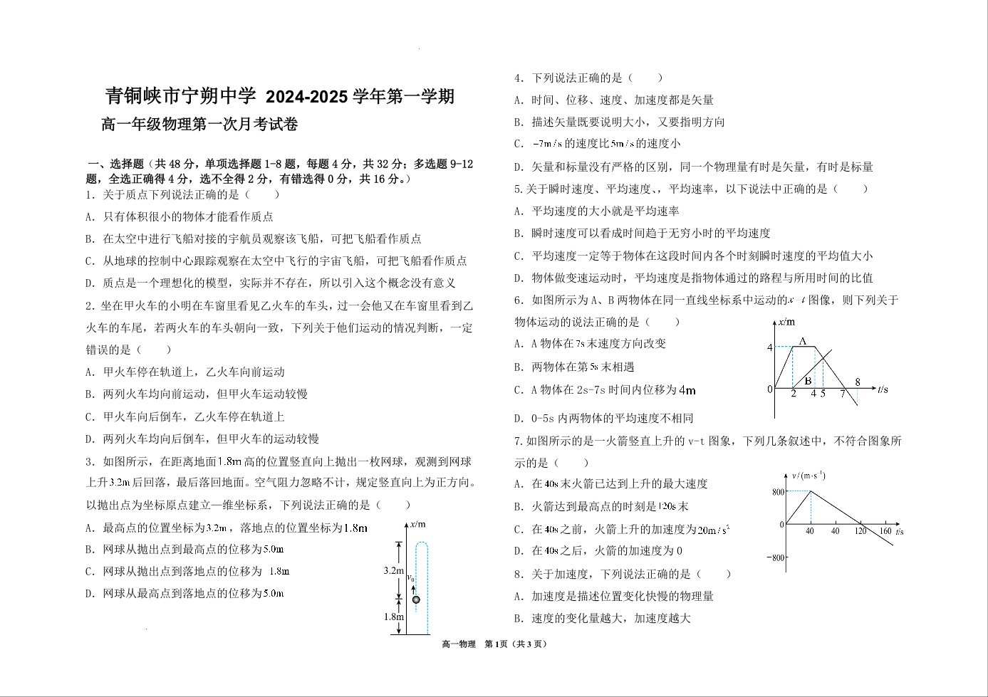 宁夏回族自治区青铜峡市宁朔中学2024-2025学年高一上学期9月月考物理