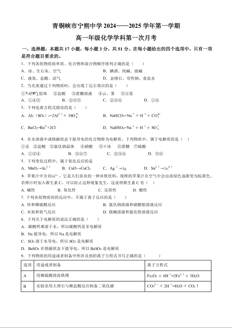 宁夏回族自治区青铜峡市宁朔中学2024-2025学年高一上学期9月月考化学+答案