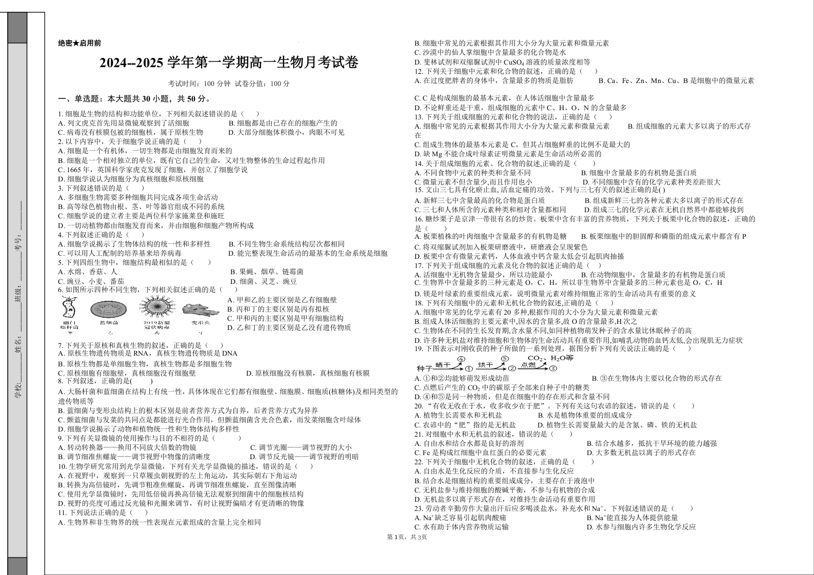 宁夏回族自治区青铜峡市宁朔中学2024-2025学年高一上学期9月月考生物