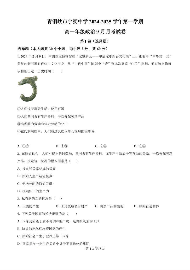 宁夏回族自治区青铜峡市宁朔中学2024-2025学年高一上学期9月月考政治(原卷版)