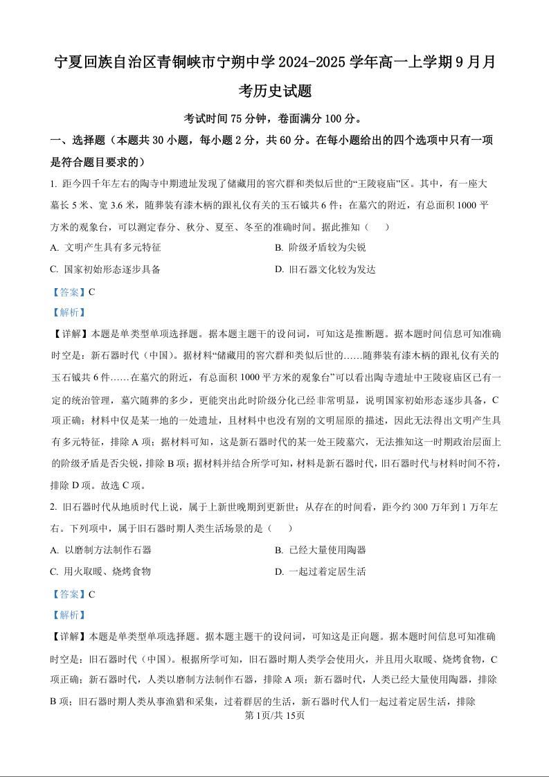 宁夏回族自治区青铜峡市宁朔中学2024-2025学年高一上学期9月月考历史(解析版)