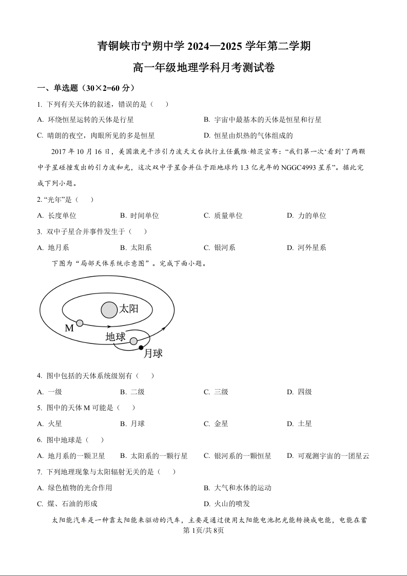 宁夏回族自治区青铜峡市宁朔中学2024-2025学年高一上学期9月月考地理(原卷版)