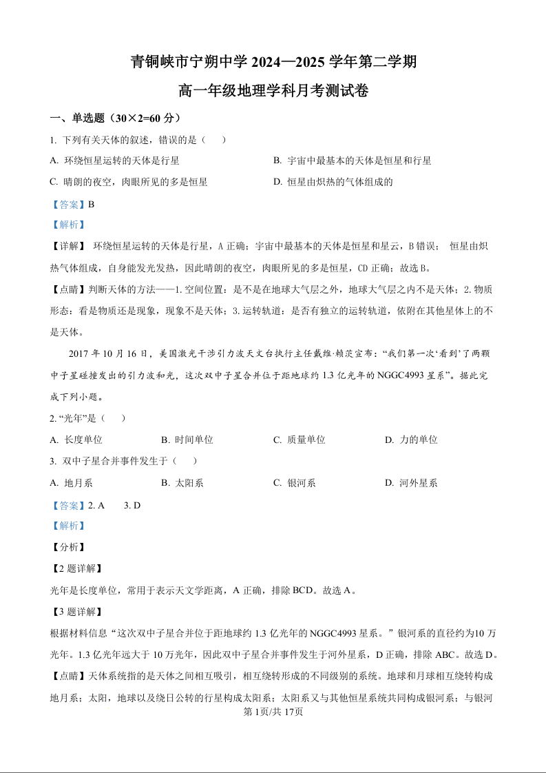宁夏回族自治区青铜峡市宁朔中学2024-2025学年高一上学期9月月考地理(解析版)