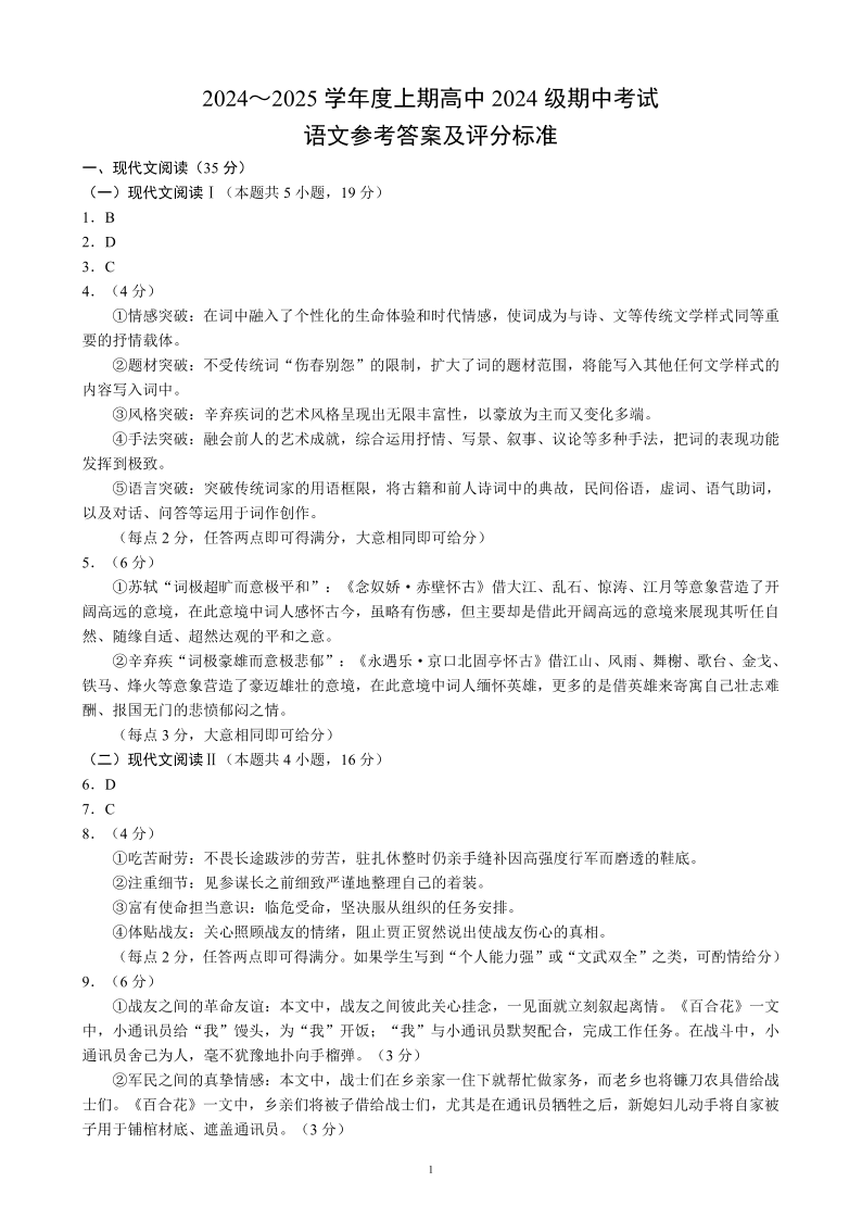 四川省成都市蓉城名校联盟2024-2025学年度上学期高中2024级期中考试语文答案
