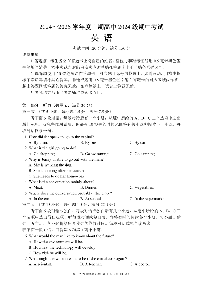 四川省成都市蓉城名校联盟2024-2025学年度上学期高中2024级期中考试英语