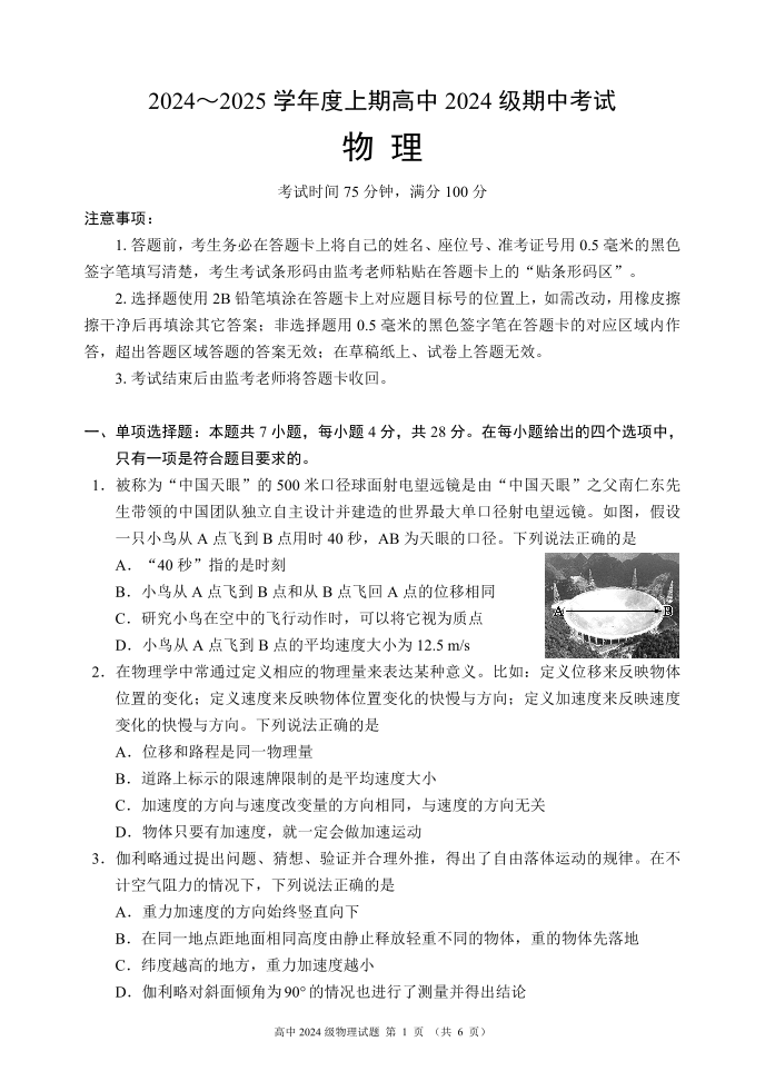 四川省成都市蓉城名校联盟2024-2025学年度上学期高中2024级期中考试物理