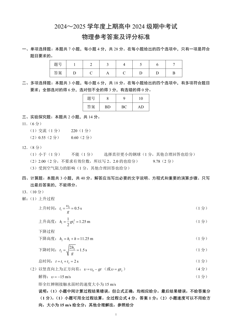 四川省成都市蓉城名校联盟2024-2025学年度上学期高中2024级期中考试物理答案