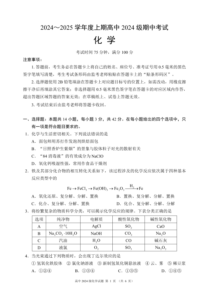四川省成都市蓉城名校联盟2024-2025学年度上学期高中2024级期中考试化学