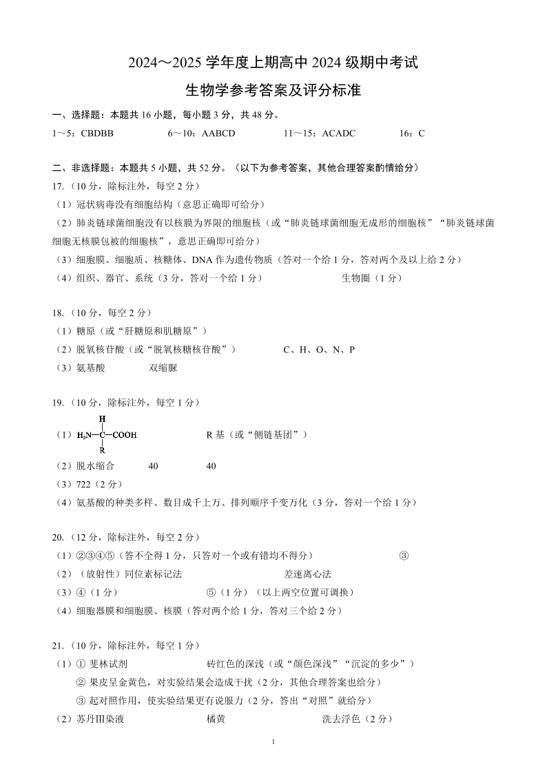 四川省成都市蓉城名校联盟2024-2025学年度上学期高中2024级期中考试生物学答案