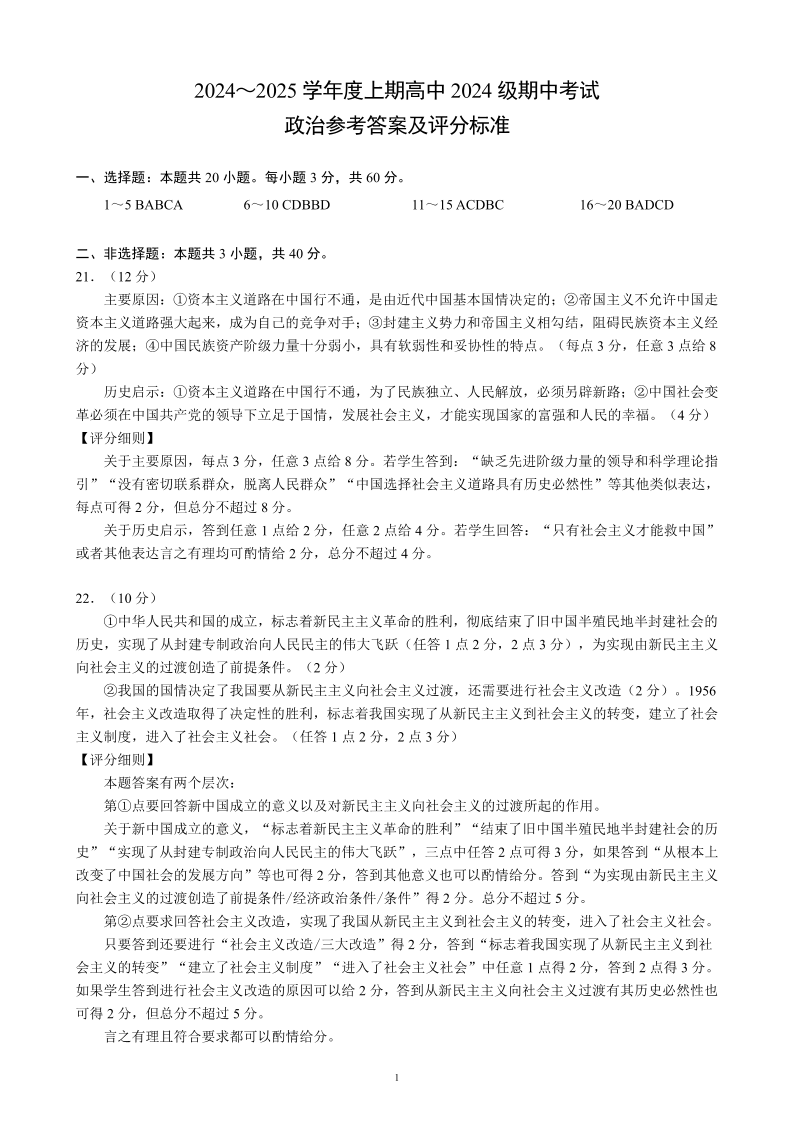 四川省成都市蓉城名校联盟2024-2025学年度上学期高中2024级期中考试政治答案