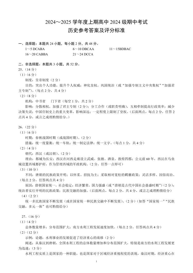 四川省成都市蓉城名校联盟2024-2025学年度上学期高中2024级期中考试历史答案