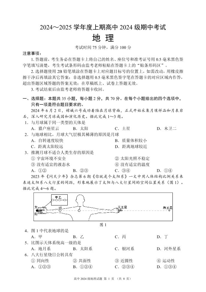 四川省成都市蓉城名校联盟2024-2025学年度上学期高中2024级期中考试地理