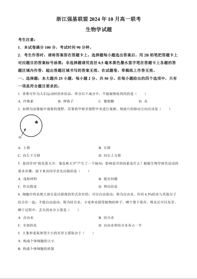 浙江省强基联盟2024-2025学年高一上学期10月联考试题生物+答案