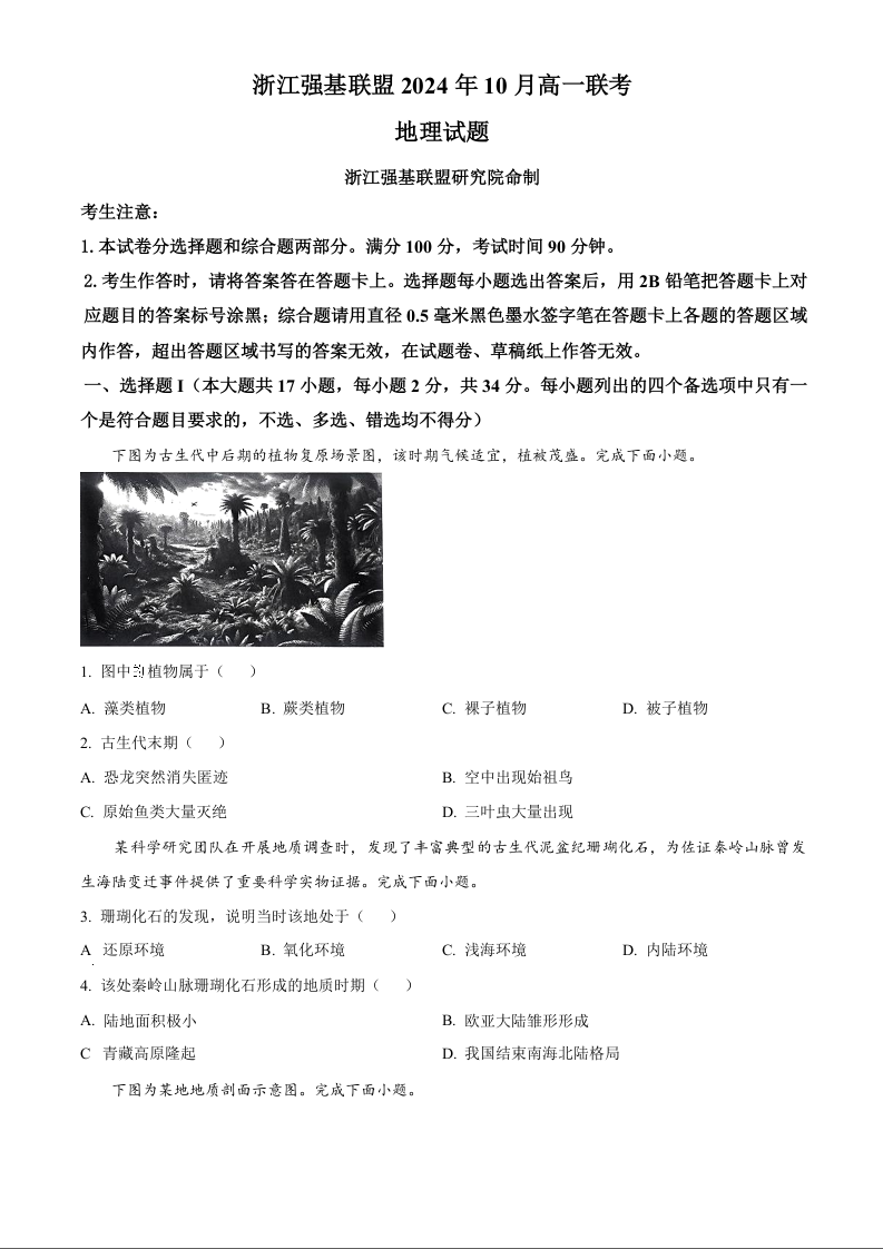 浙江省强基联盟2024-2025学年高一上学期10月联考试题地理+答案