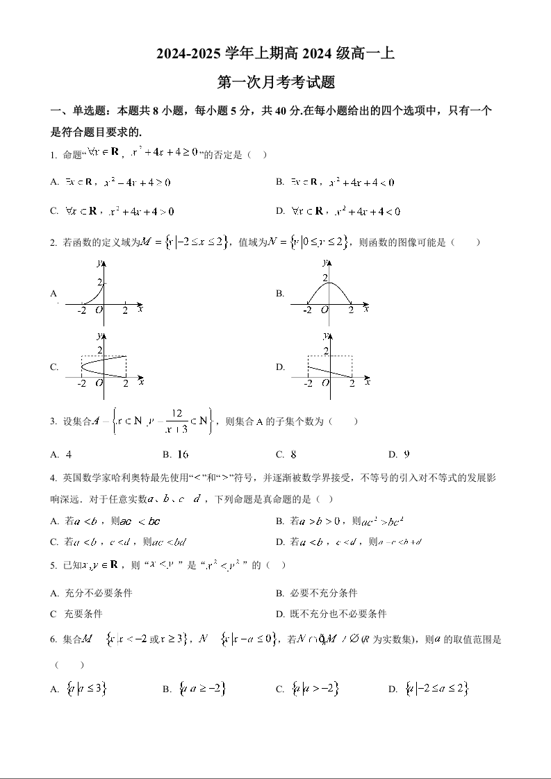 重庆市九龙坡区重庆渝西中学2024年秋高一上10月月考数学