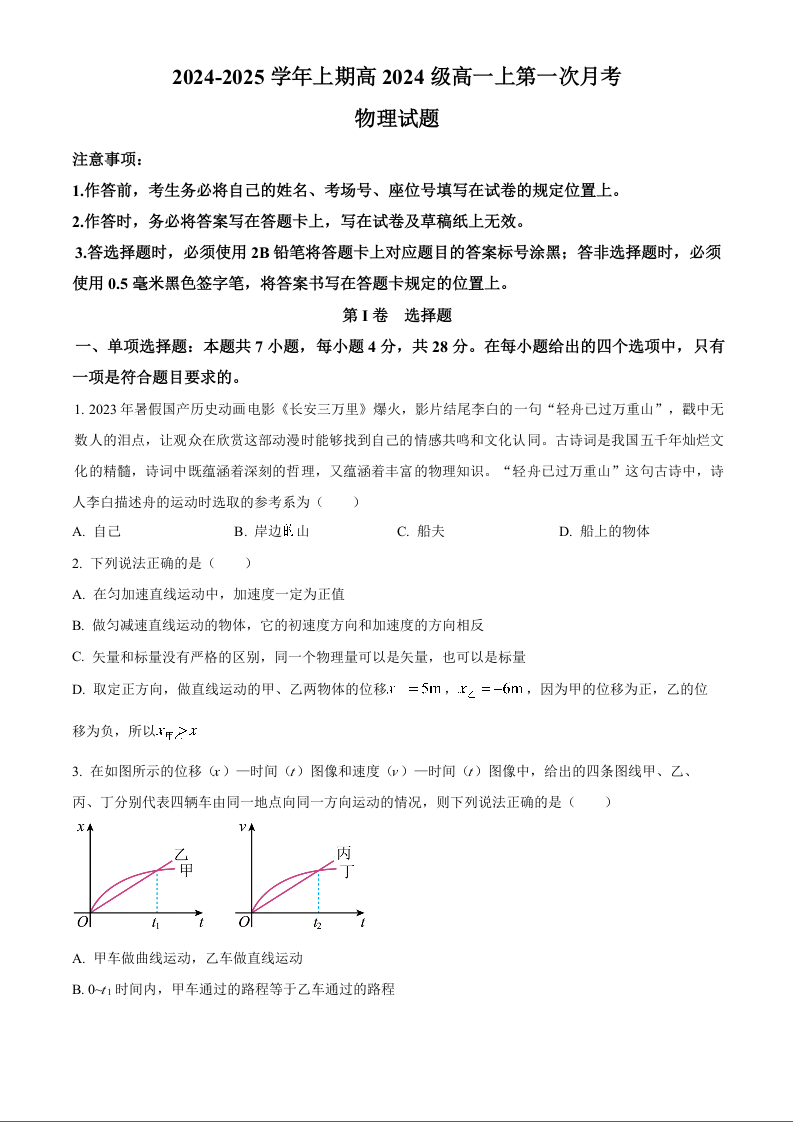 重庆市九龙坡区重庆渝西中学2024年秋高一上10月月考物理