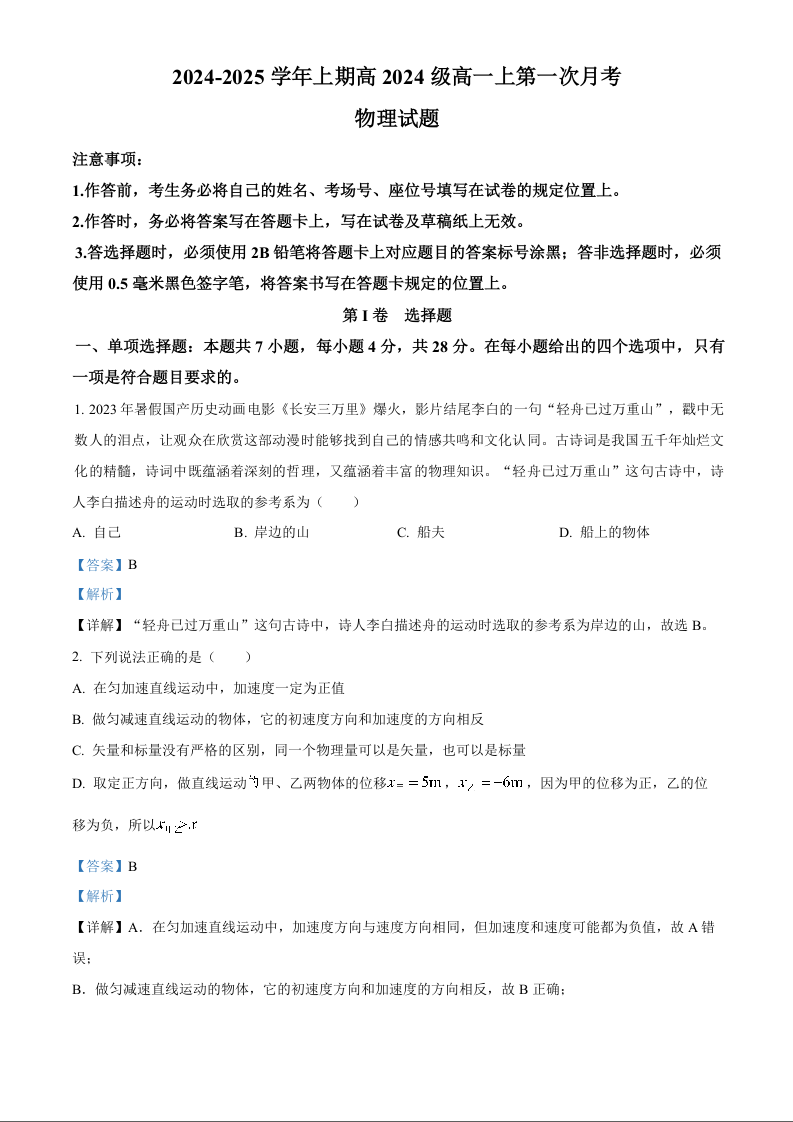 重庆市九龙坡区重庆渝西中学2024年秋高一上10月月考物理+答案