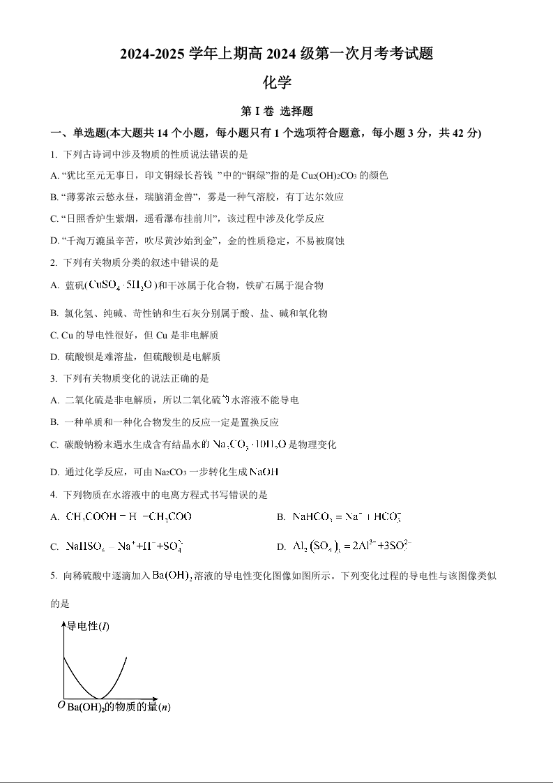 重庆市九龙坡区重庆渝西中学2024年秋高一上10月月考化学