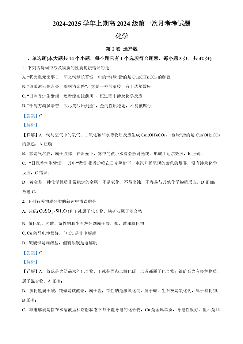 重庆市九龙坡区重庆渝西中学2024年秋高一上10月月考化学+答案