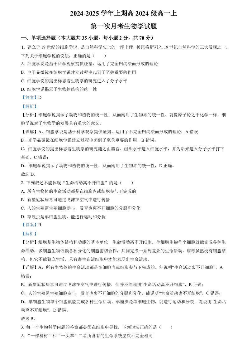 重庆市九龙坡区重庆渝西中学2024年秋高一上10月月考生物+答案