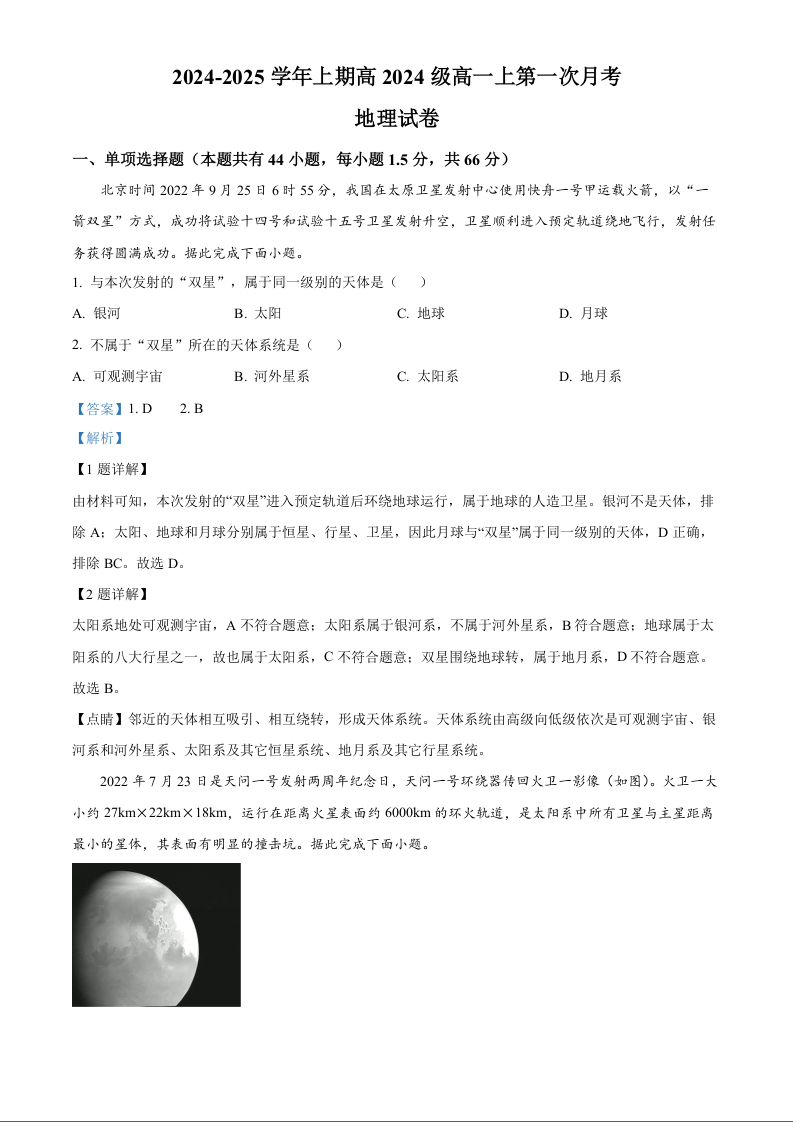 重庆市九龙坡区重庆渝西中学2024年秋高一上10月月考地理试题+答案