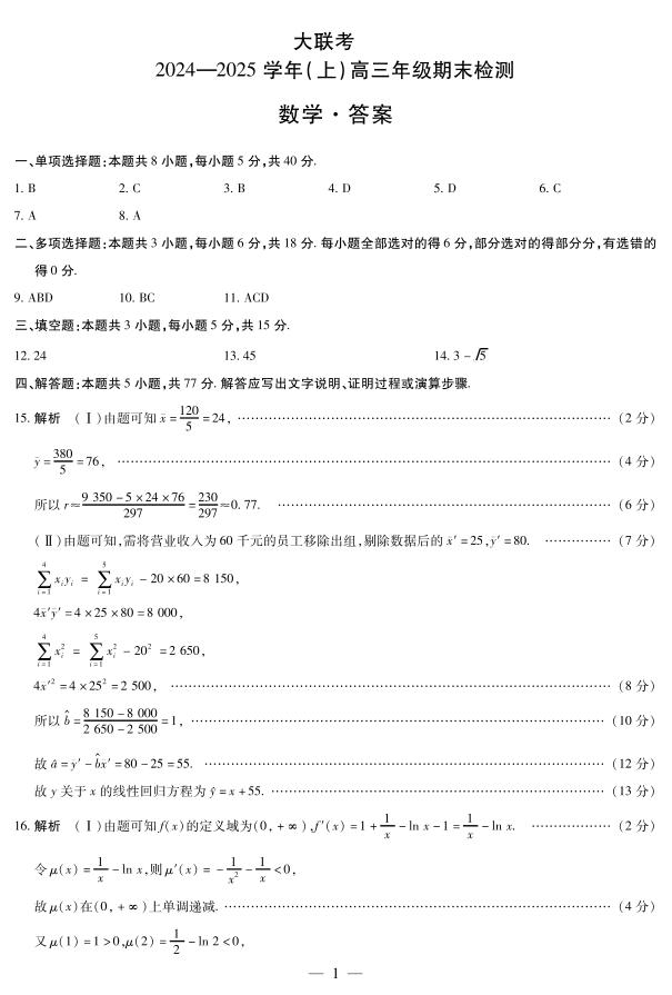 河南省天一大联考2025届高三上学期1月期末考试数学答案