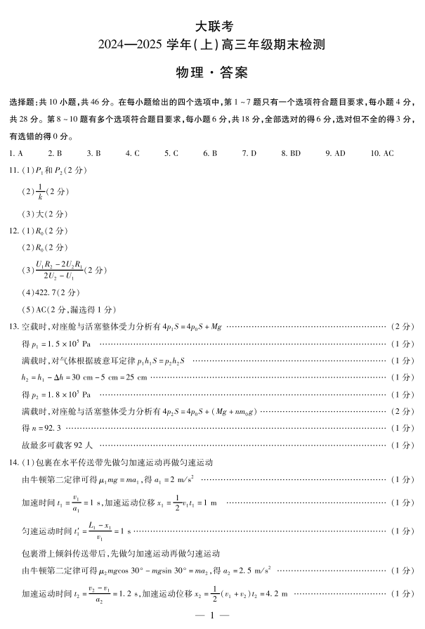 河南省天一大联考2025届高三上学期1月期末考试物理答案