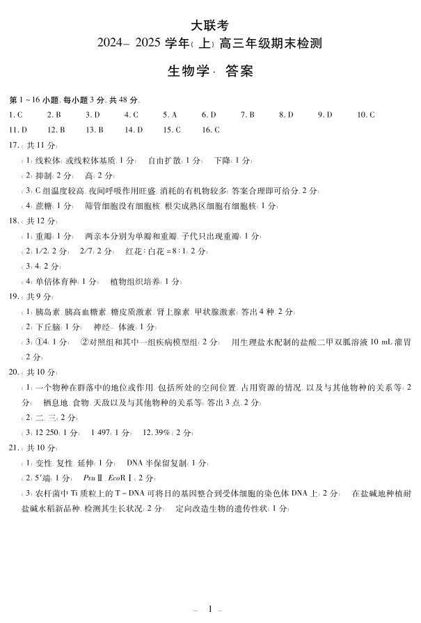 河南省天一大联考2025届高三上学期1月期末考试生物答案