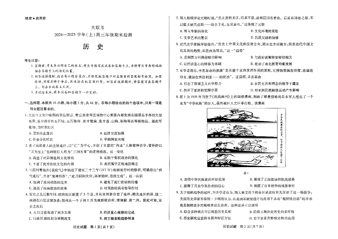 河南省天一大联考2025届高三上学期1月期末考试历史