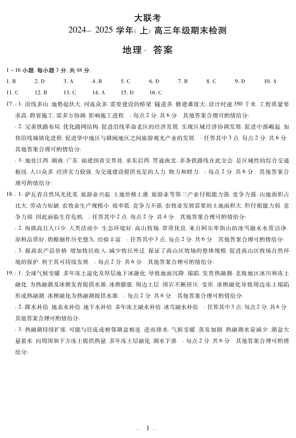 河南省天一大联考2025届高三上学期1月期末考试地理答案