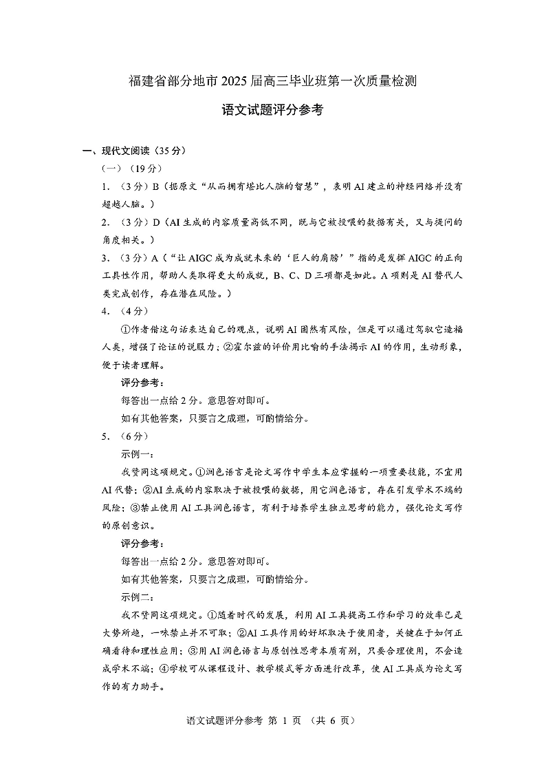 福建省六市2025届高中毕业班第一次质量检测(一模)语文答案