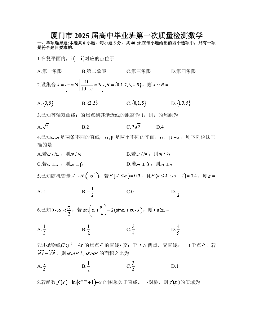 福建省六市2025届高中毕业班第一次质量检测(一模)数学