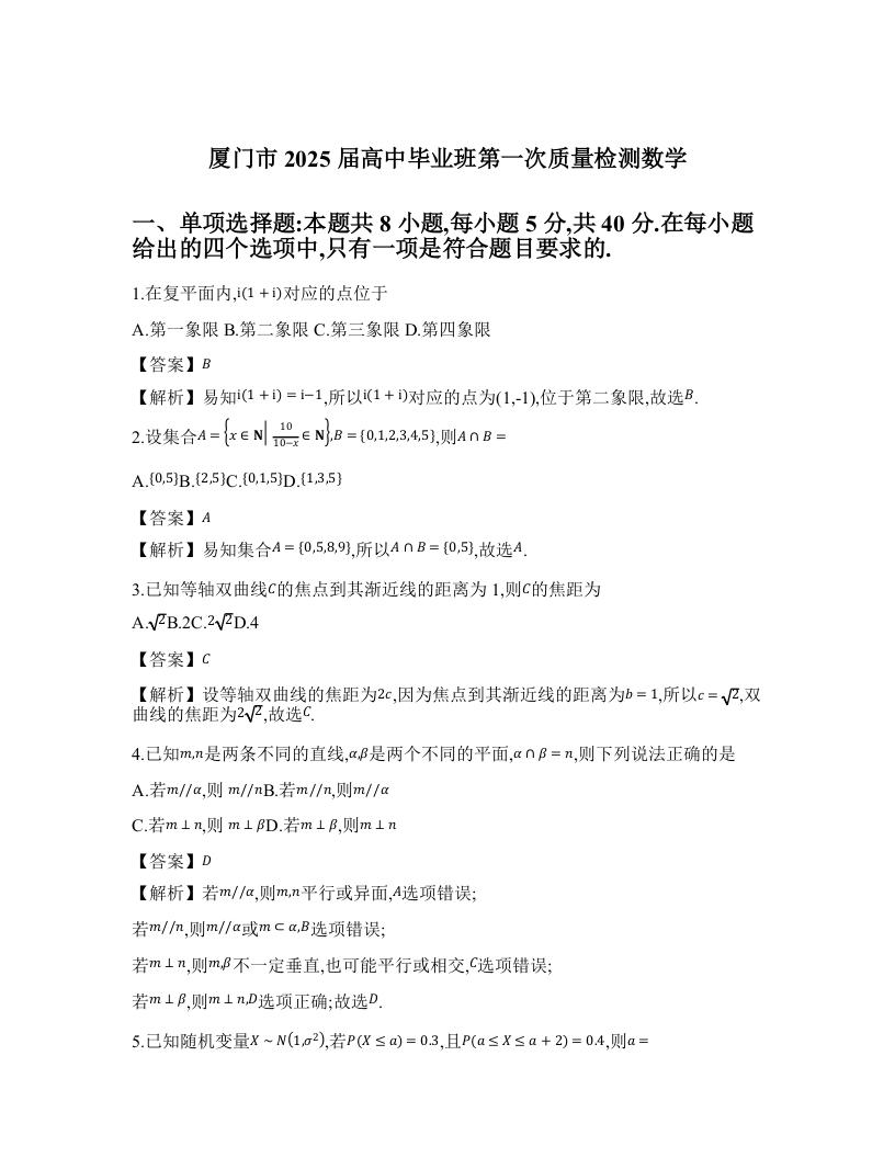 福建省六市2025届高中毕业班第一次质量检测(一模)数学答案