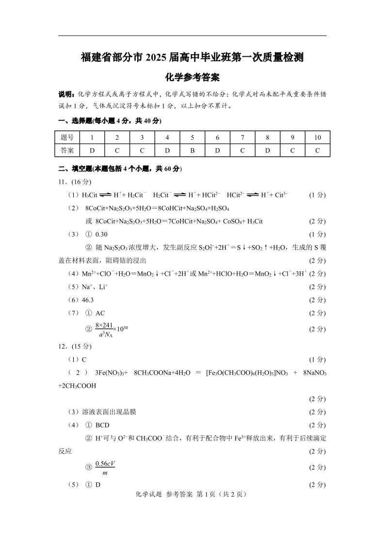 福建省六市2025届高中毕业班第一次质量检测(一模)化学答案