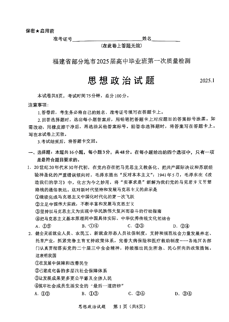 福建省六市2025届高中毕业班第一次质量检测(一模)政治