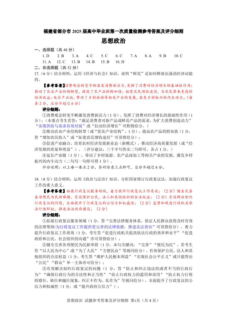 福建省六市2025届高中毕业班第一次质量检测(一模)政治答案