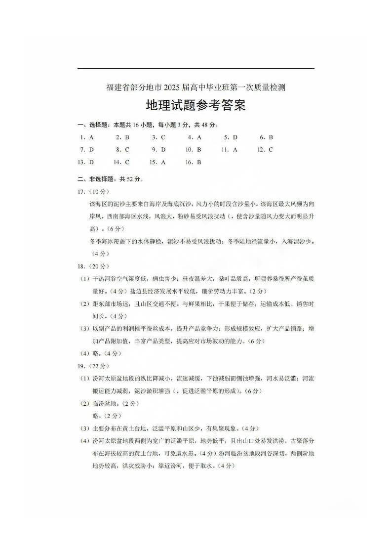 福建省六市2025届高中毕业班第一次质量检测(一模)地理答案