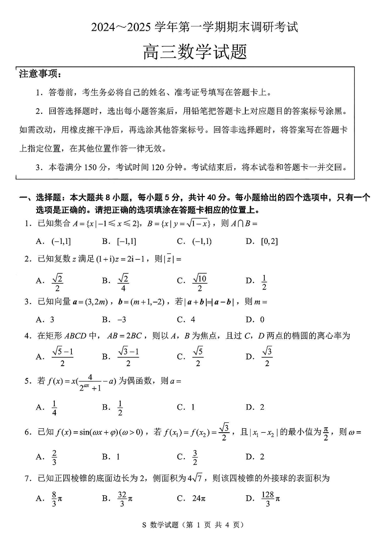 江苏省苏北四市(徐宿淮连) 2025届高三第一次调研测试数学+答案