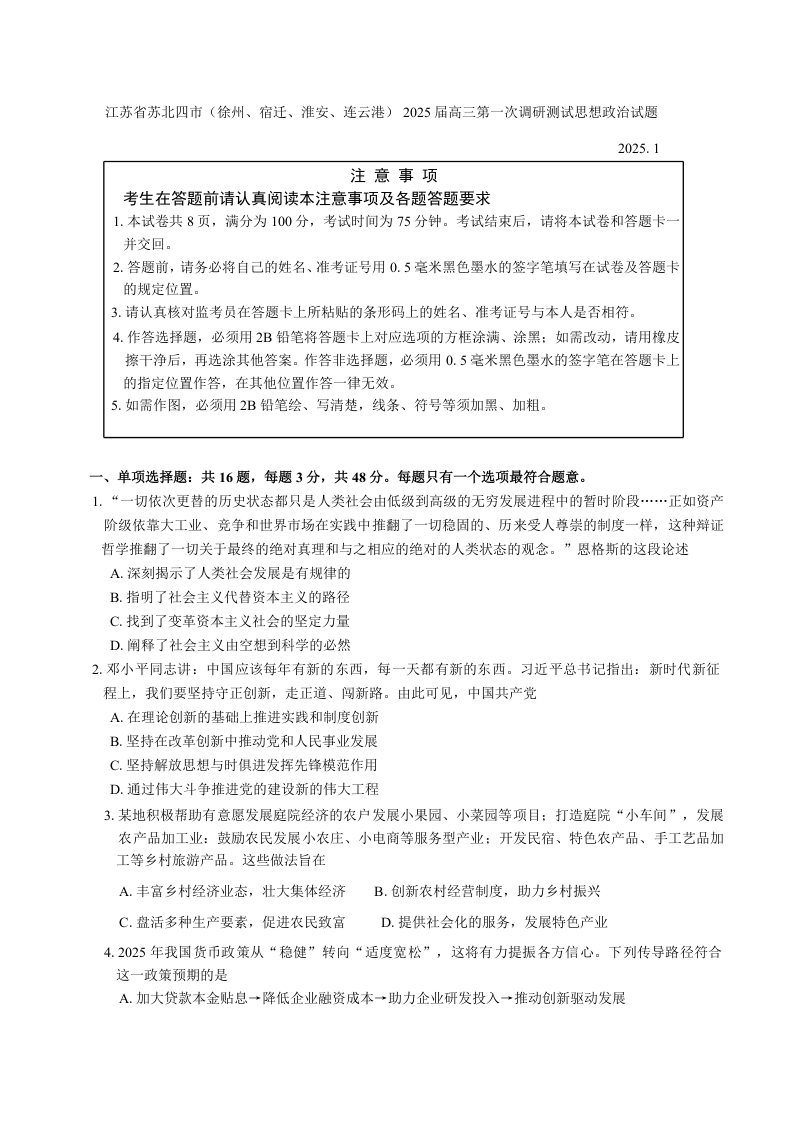 江苏省苏北四市(徐宿淮连) 2025届高三第一次调研测试政治+答案